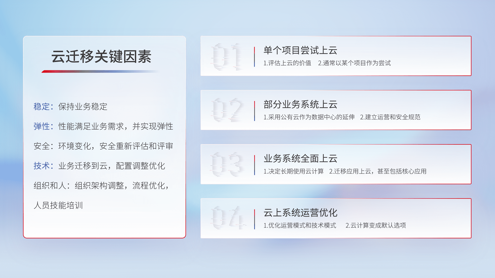 结合实际业务,,,从规划设计、、、云平台选型、、、、云原生改造、、数据迁移、、集成交付,,迁移全过程为客户识别最佳上云路径,,做好风险识别管理,,,设计网络架构、、、、身份权限、、、、安全审计合规、、、操作审计、、、、日志审计、、、、监控告警策略、、、多站点容灾设计等,,,,对云上基础设施进行整体规划,,,,提升IT治理水平,,以满足弹性、、、高可用、、、高性能的需求。。。。