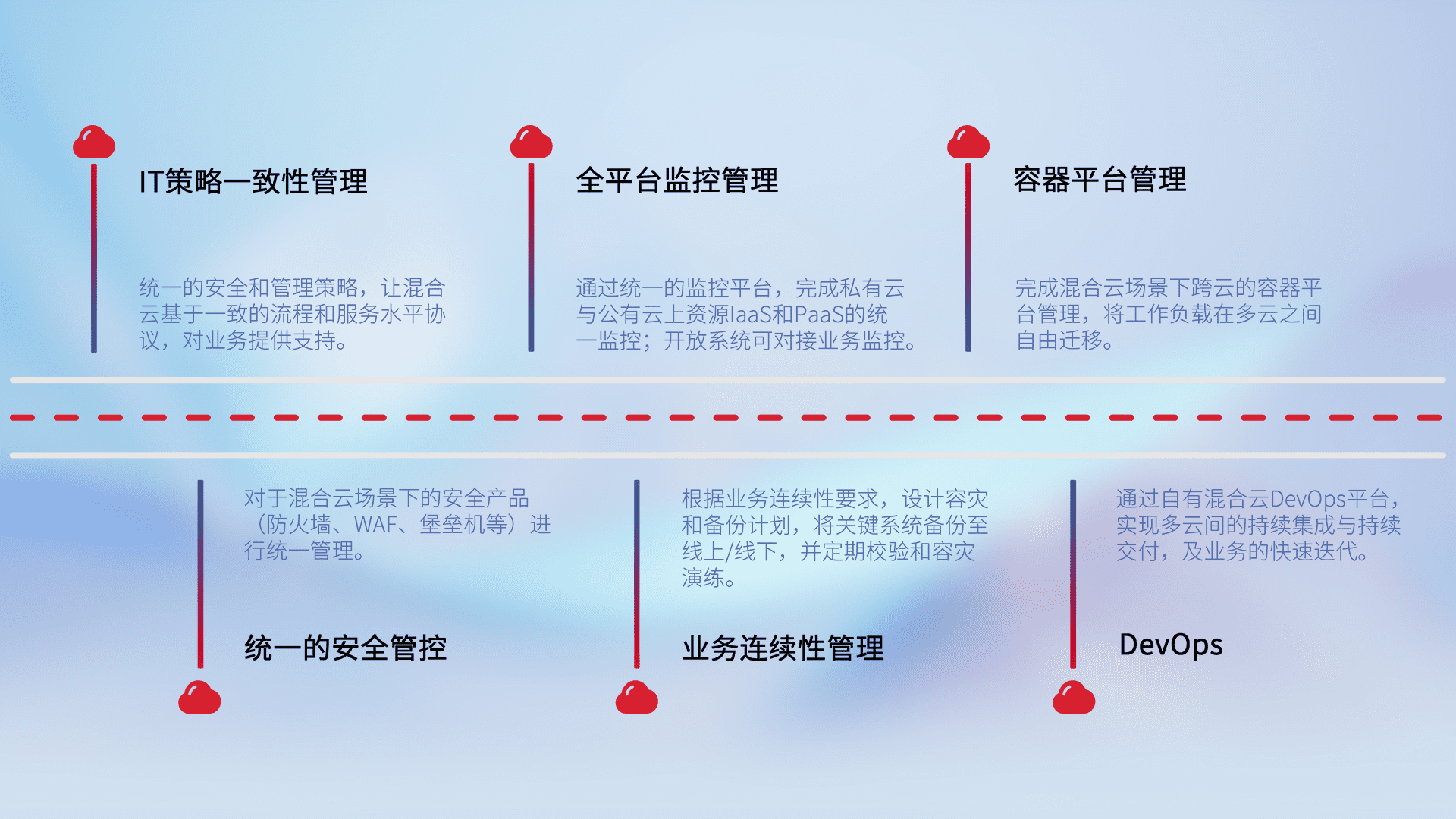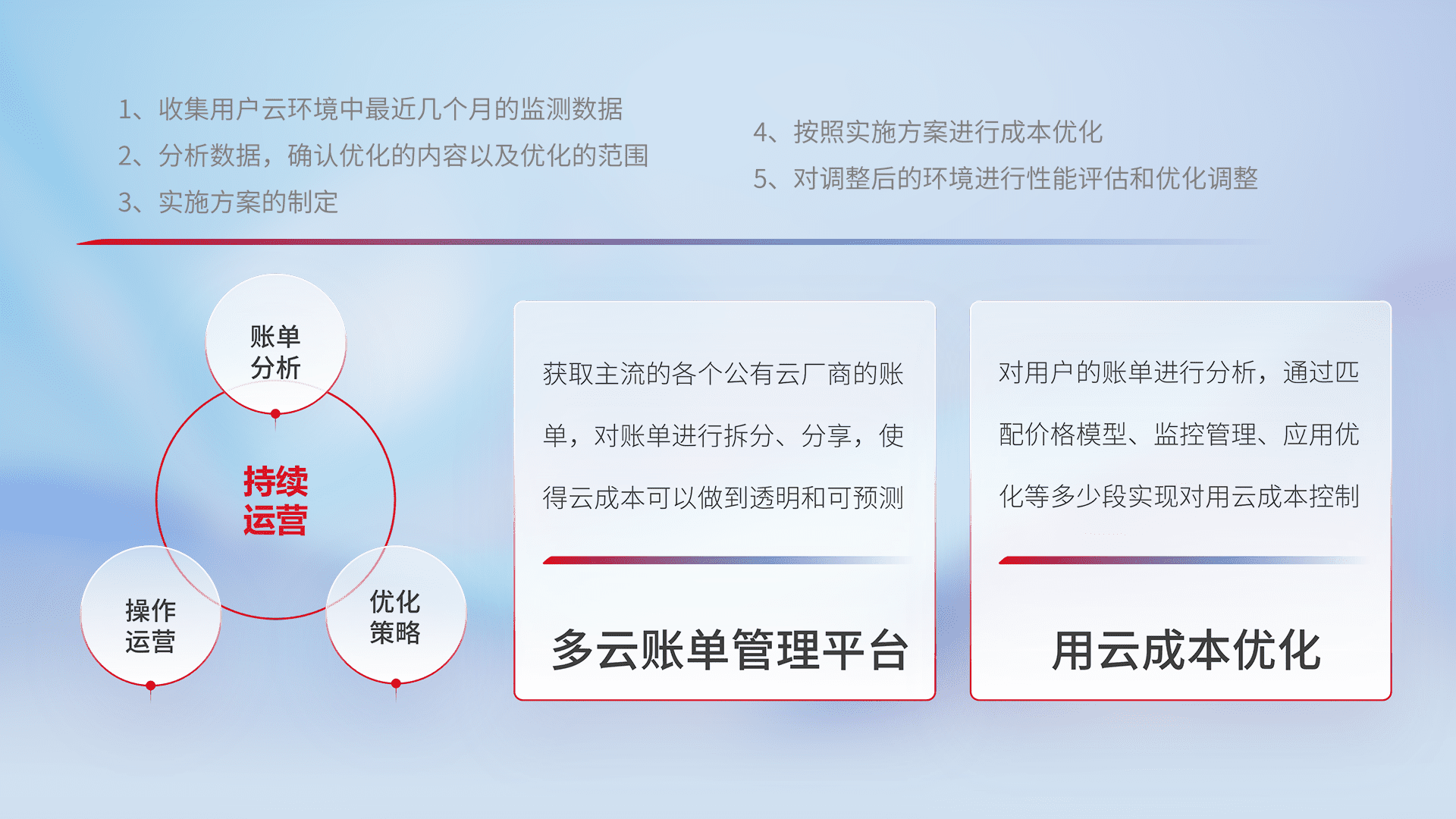 通过多云纳管,,以统一的资源数据模型把客户的云资源进行抽象和封装,,,,进而实现对多云资源的统一操作,,,保障云资源管理的可靠性、、、稳定性与可用性。。。量身定制化运维内容,,,配置、、、开发运维、、、补丁管理、、、、备份、、、监控、、、认证和访问管理、、、、审计和日常巡检等,,,,保障在用云过程中的可靠度,,,稳定度以及高可用率。。。